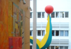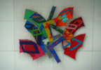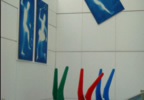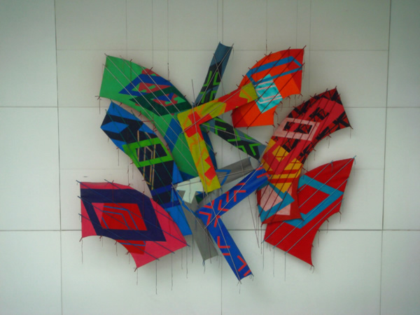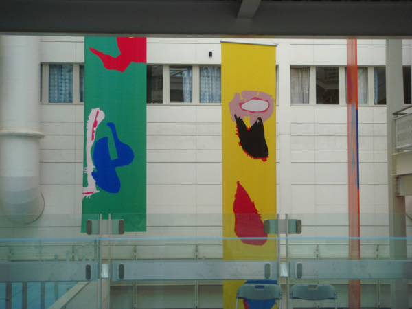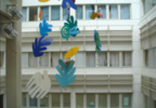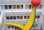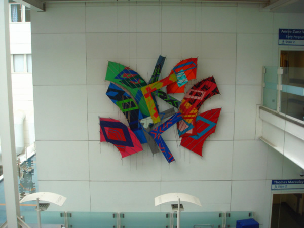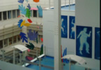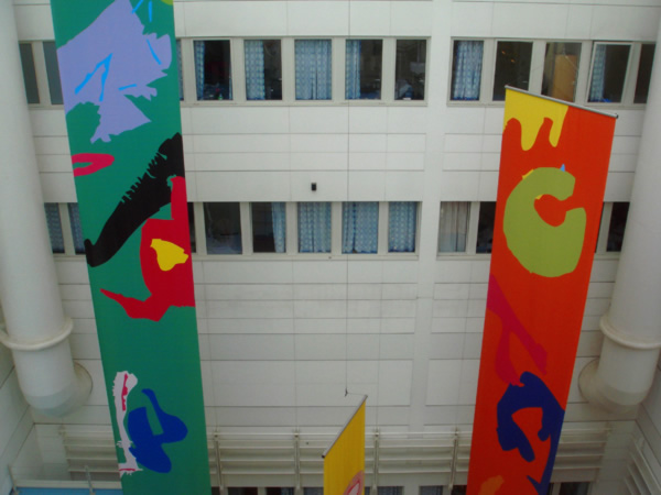 Sculture che si librano in aria per ben 18 metri, banner e mobile svolazzano lungo i cinque piani dell’edificio. Ed enormi tele che trovano lo spazio adatto per respirare.